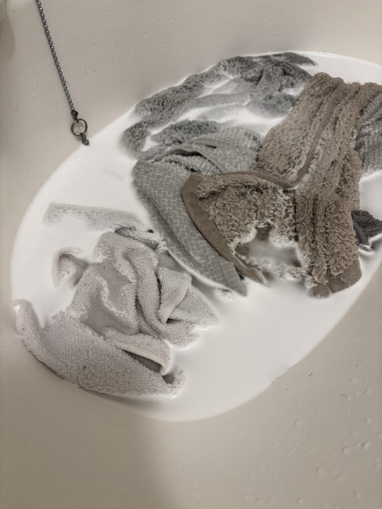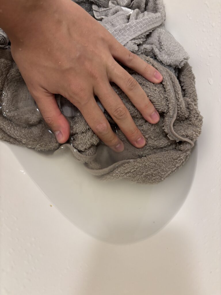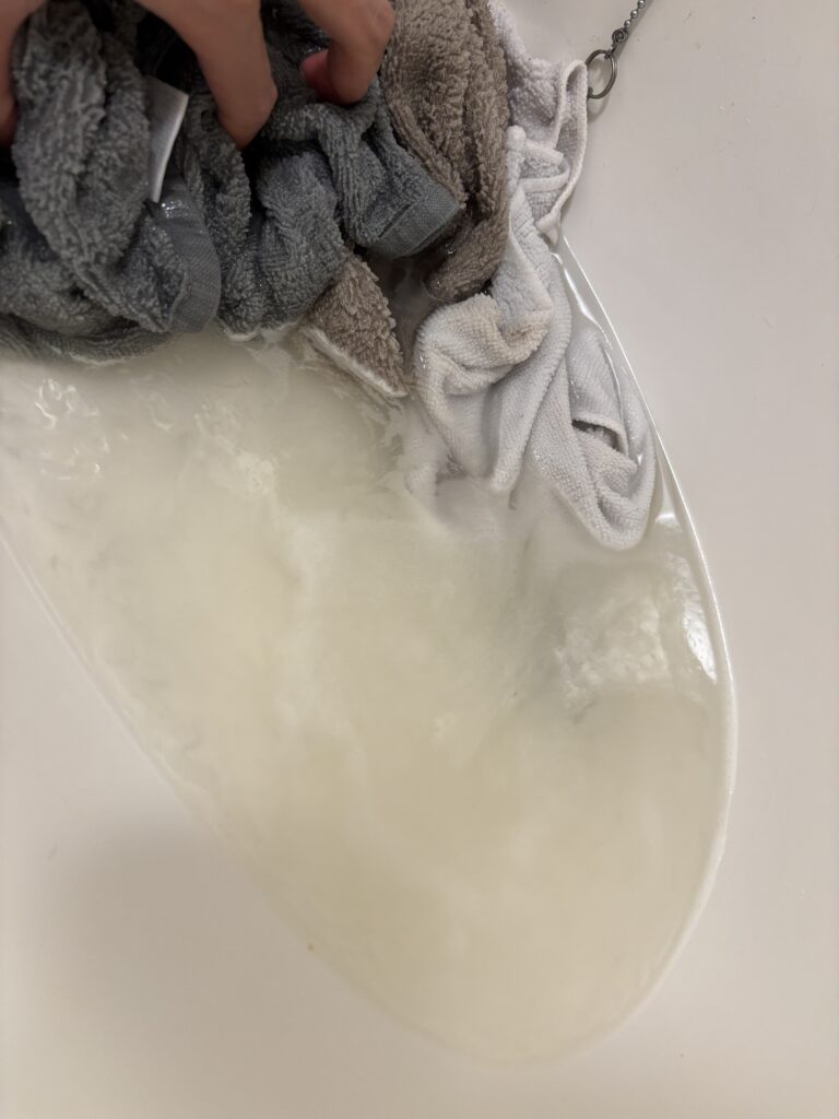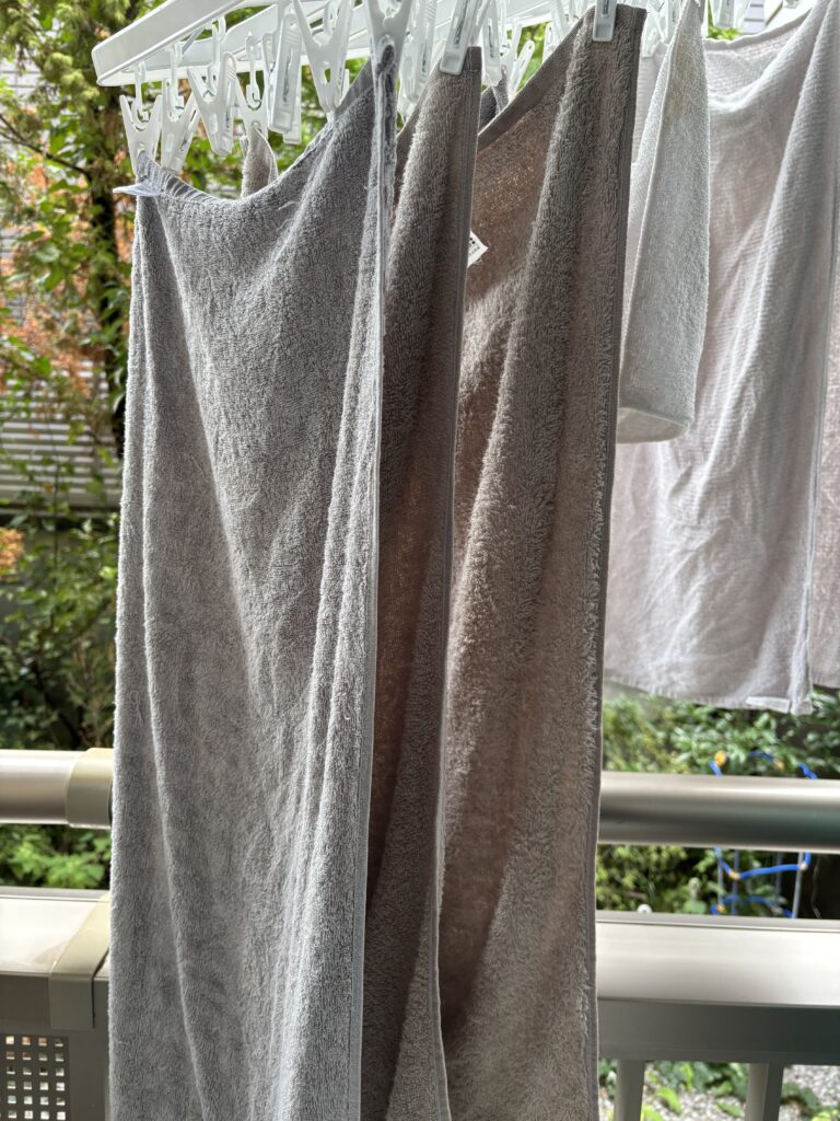 4. 漬け置き後、タオルを軽くすすいで(あるいはそのまま洗濯機で通常洗い)、風通しの良い場所または乾燥機で乾燥。
